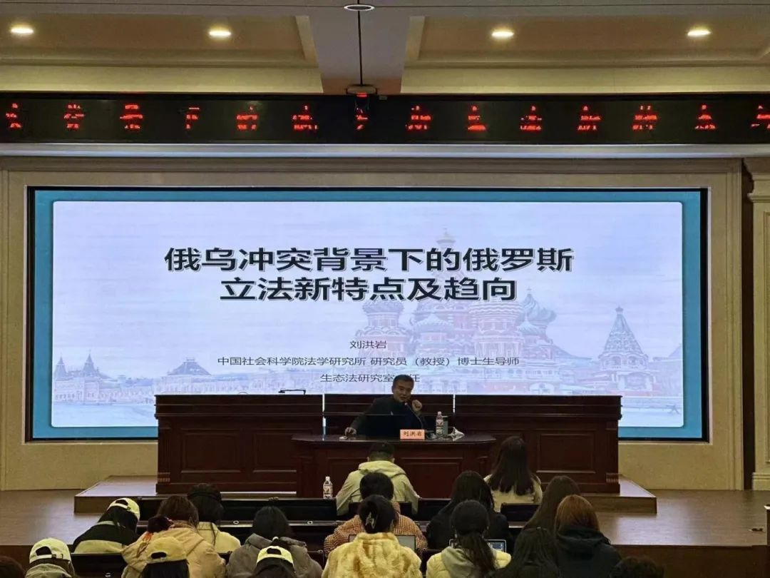 3月28日,邀请到中国社会科学院法学研究所研究员、生态法研究室主任、中国社会科学院大学教授、博士生导师、博士后合作导师、环境与资源保护法教研室主任刘洪岩教授作为主讲嘉宾,讲座题目为“俄乌冲突背景下的俄罗斯立法新特点与趋向”,刘洪岩教授揭示了俄乌冲突是大国博弈下国际秩序重组的底层逻辑,并从历史维度持续性梳理了俄乌国家政治关系的演进。讲座现场,刘洪岩教授以其丰富的学术造诣和深刻的见解,引领听众们深入了解了俄乌冲突的复杂性和深刻影响。他指出,俄乌冲突不仅仅是两国之间的地缘政治博弈,更是涉及国际法、文化、历史等多方面因素的综合交织。通过对俄罗斯立法新特点与趋向的剖析,揭示了俄罗斯在当前国际环境下的法律发展趋势和挑战。