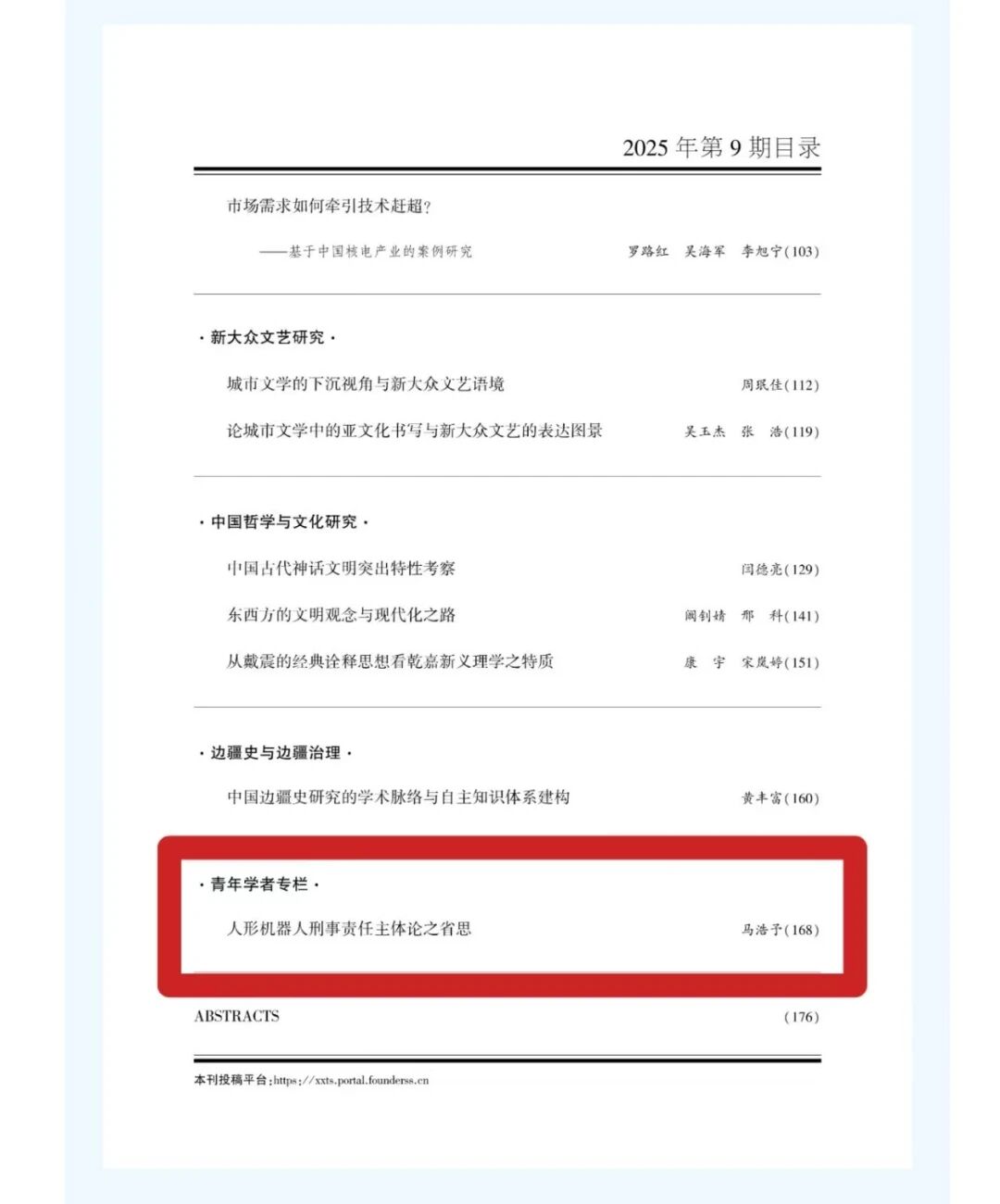 p站视频 马浩予老师论文《人形机器人刑事责任主体论之省思》被《学习与探索》2025年第9期收录。