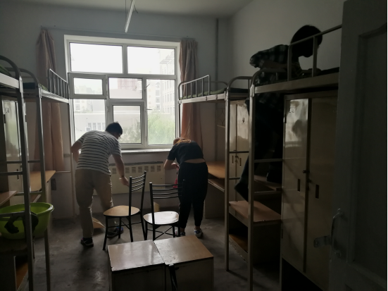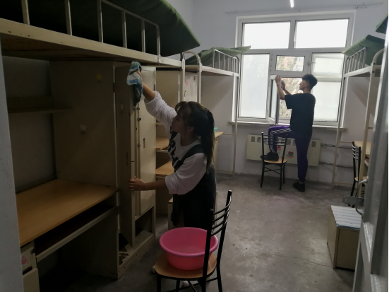 他们怀着对学弟学妹们的期待,力求将寝室打扫得一尘不染。由于事先合理的工作分配为同学们节省了很多时间,新生寝室在学长学姐们的“奋战”下都焕然一新,窗户、床架被擦拭干净,垃圾全被清除,桌椅摆放整齐划一。