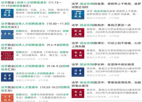一是召开多层次就业宣讲。召开就业动员宣讲会、就业工作推进会、家长会等就业宣讲20余场,为2024届毕业生分析当前就业形势,积极引导其转变就业观念和就业方式。二是开展立体化培训。根据不同学生群体的就业意向,搭建多渠道平台开展针对性培训,邀请校友、律师、公考讲师开展系列讲座,努力做到精准服务、有效培训、全方位提升。三是进行多角度就业宣传。及时推送各类就业信息与就业政策,依托学院公众号推出法律人才招聘直通车5期,就业先锋系列推送6期,求职贴士等,营造良好就业氛围。