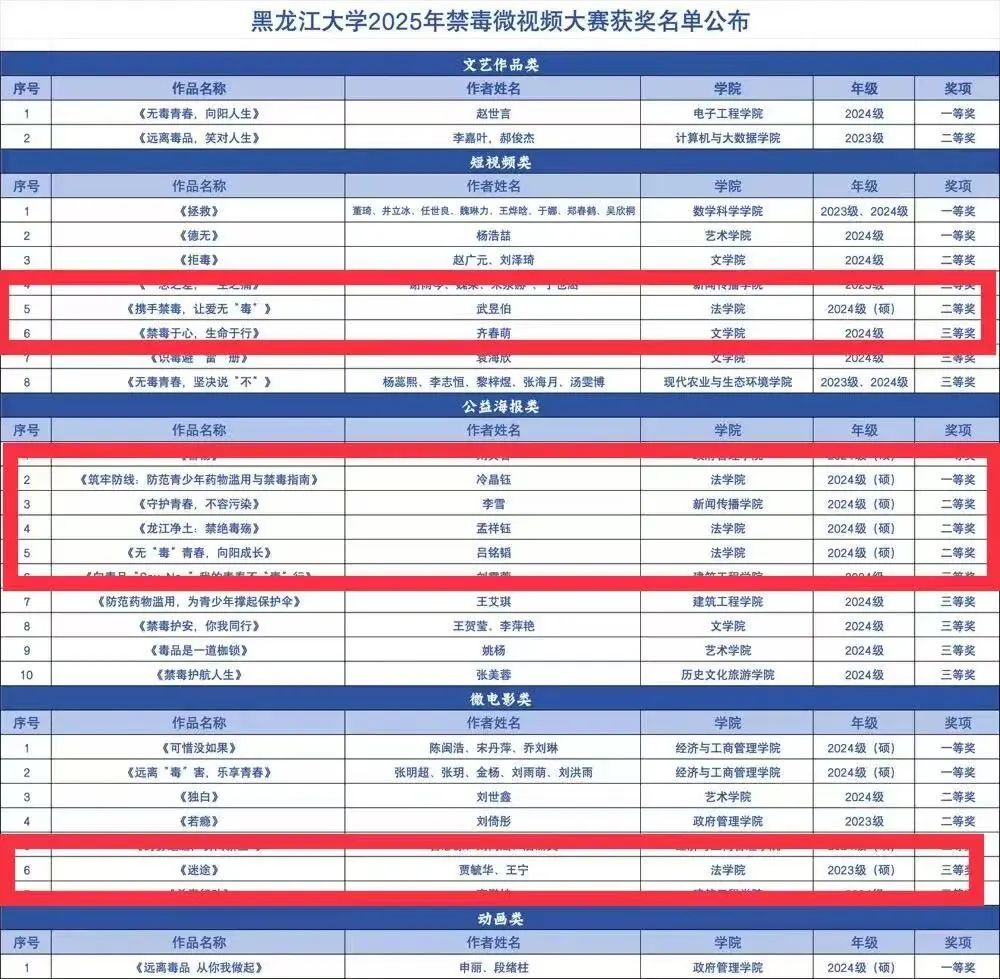 2025年6月是第15个全民禁毒宣传月。今年国际禁毒日的主题是“健康人生,绿色无毒”。为切实提高广大师生识毒、防毒、拒毒能力,筑牢校园安全防线,2025年5月-6月,学校举办“无毒青春路·筑梦龙江魂”禁毒微视频创意大赛,比赛由“守护成长”安全教育与危机事件应对辅导员工作室承办。其中p站视频 1名同学获得一等奖,3名同学获得二等奖,1名同学获得三等奖。