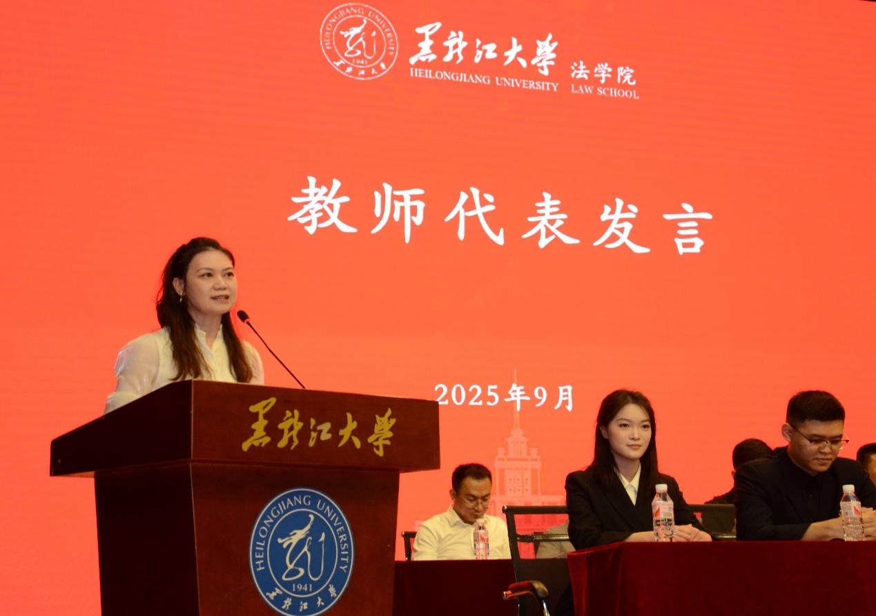 教授康琳娜老师代表全体教师发言。她希望每一位同学都能心怀正义、坚守良知,始终敬畏规则、明辨是非,坚定走在法治的道路上;同时做到博学慎思、知行合一,不仅要扎实学习法学理论,更要将知识转化为行动;还要兼容并蓄、全面发展,在各类活动中培养批判性思维和独立人格,成长为有温度、有深度、有广度的法律人。