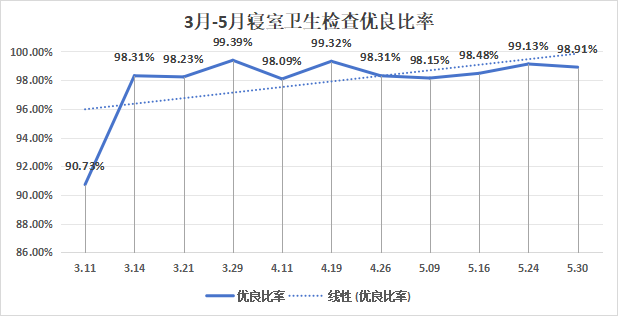 高度重视寝室文化育人功能与寝室长队伍建设,开学以来举办了“寝室心理联络员培训”、“法律精英寝室挑战赛”、“以书润心、寝室共读”、“党建结对、寝室共建”活动;同时进一步加强劳动教育,培养学生养成良好的劳动意识和健康的生活习惯,强化寝室卫生安全管理,在3月至5月寝室卫生检查中,学院寝室卫生整体向好,逐步探索形成了学生寝室卫生、文明教育和管理的长效机制。