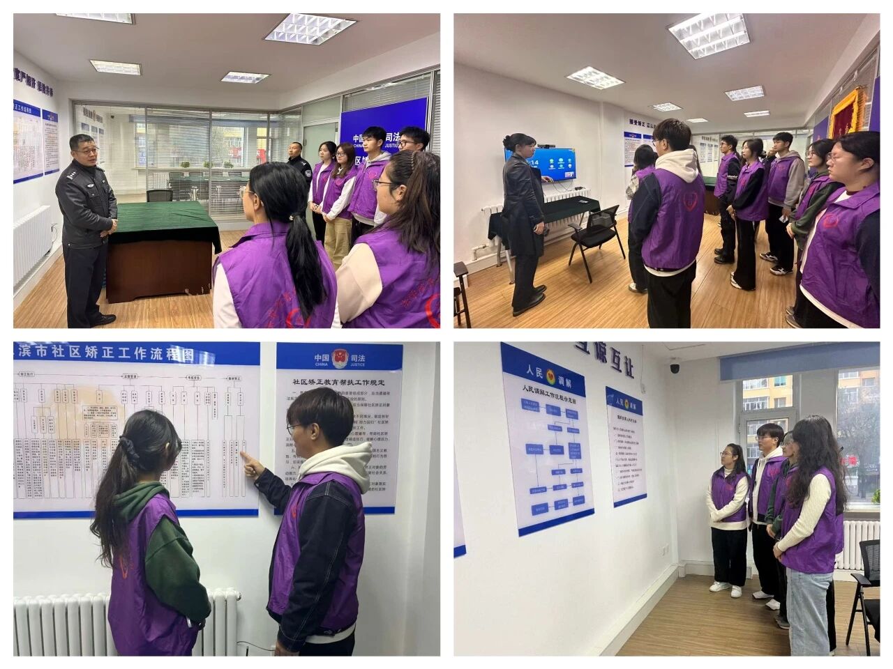 青年志愿者协会组织同学们走进黑龙江省哈尔滨市道外区司法局大有坊司法所开展参观学习。本次活动由司法所所长杨璐主持,副所长王品、哈尔滨市司法局矫正支队二大队队长杨宇先后讲解,人民调解员全程协助。