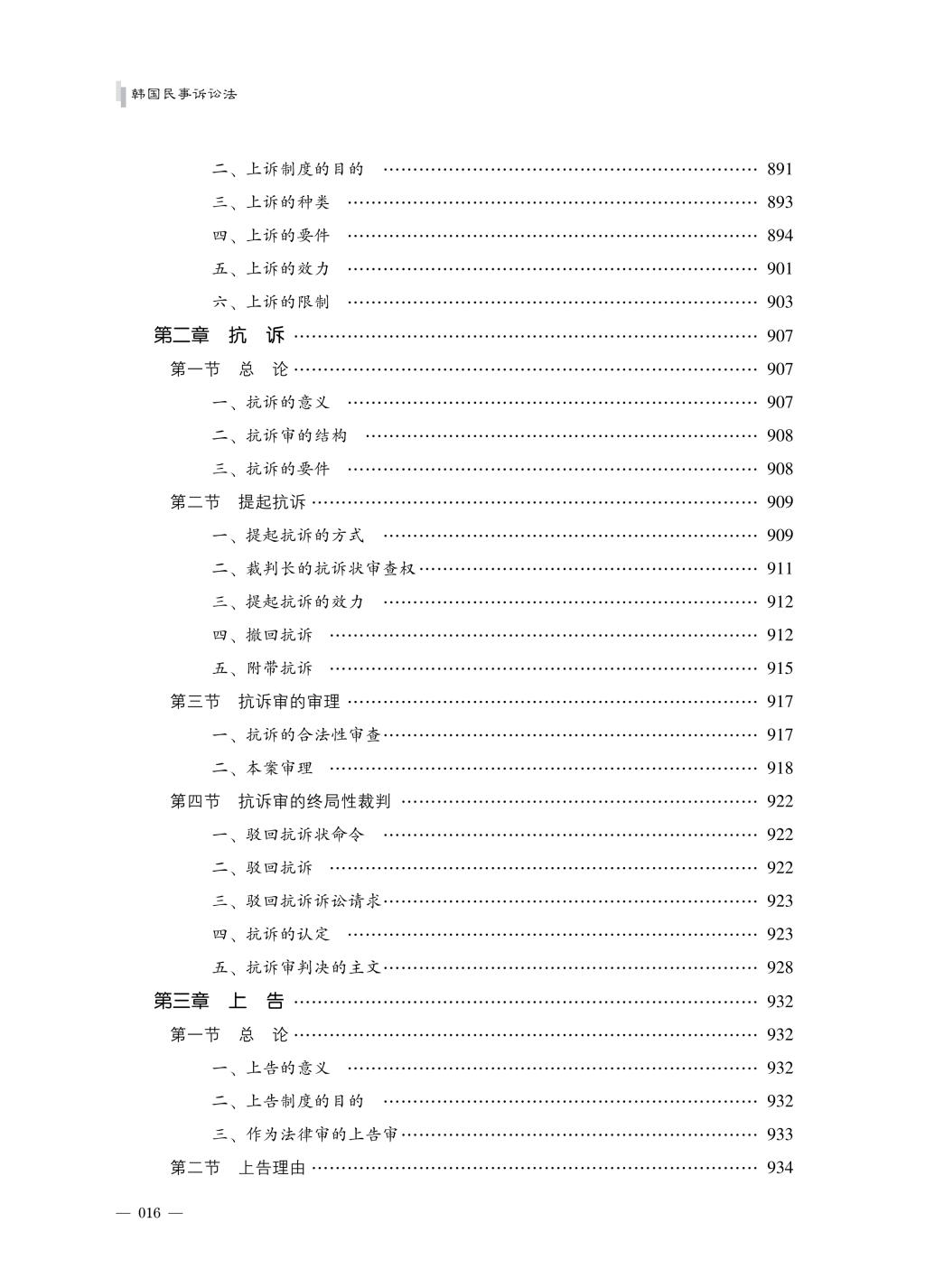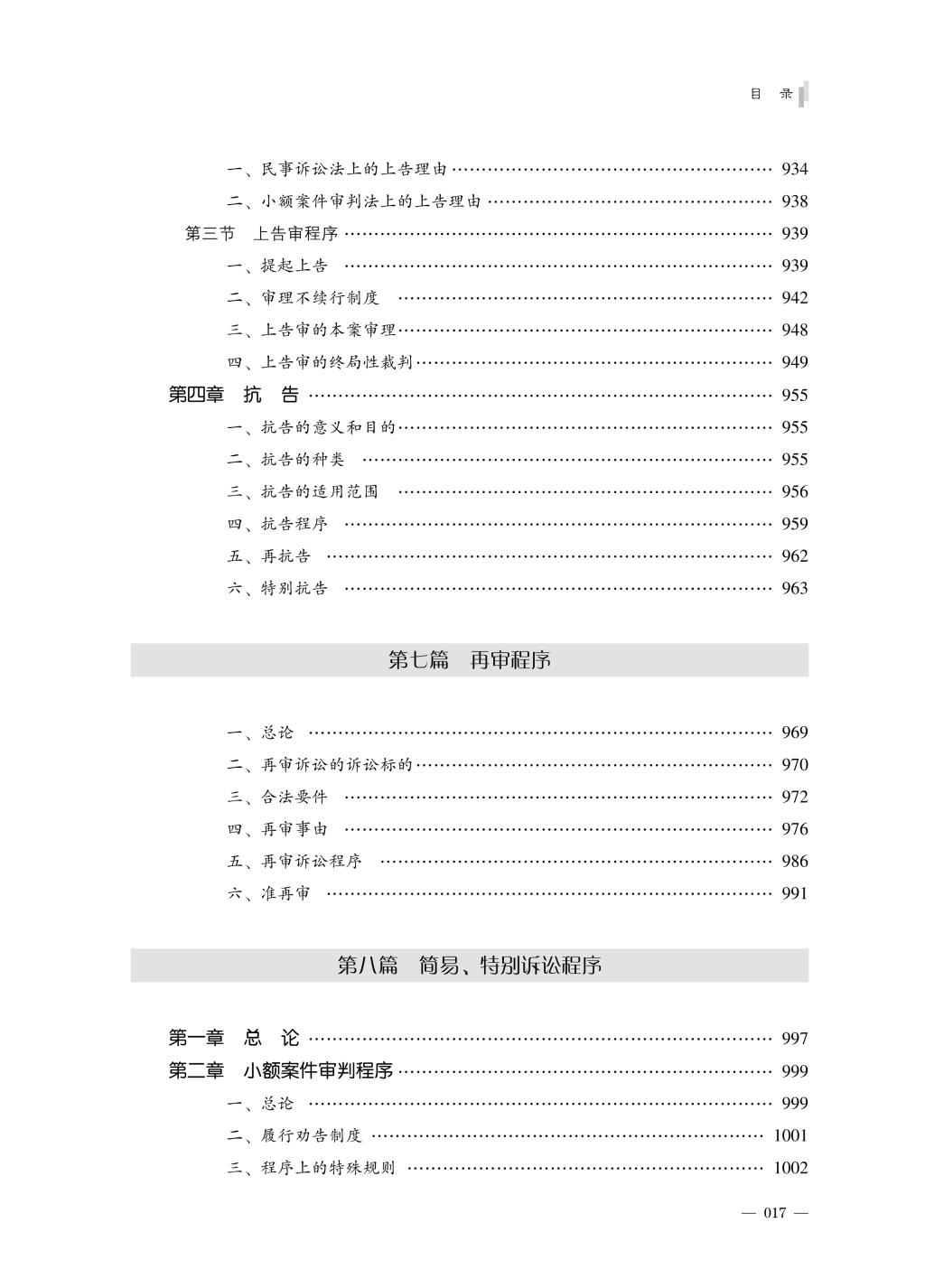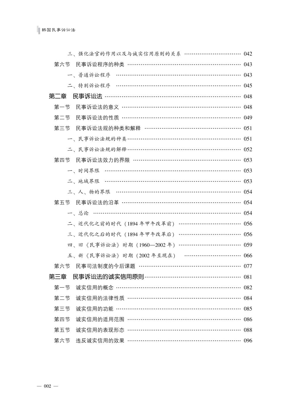 本书共分为八篇。第一篇绪论分为三章,第一章总论(民事诉讼的概念)、第二章民事诉讼法、第三章民事诉讼法的诚实信用原则;第二篇诉讼的主体分为两章,第一章法院(法院的组成、裁判权、管辖等)、第二章当事人即原告与被告(当事人的确定、当事人能力、诉讼能力、辩论能力、当事人适格、诉讼上的代理人等);第三篇第一审诉讼程序分为两章,第一章诉讼的开始(诉的意义及种类、诉讼要件、诉之利益、诉讼标的、诉提起的效果、赔偿命令制度、诉讼救助等)、第二章诉讼的审理(审理的基本原则、辩论、辩论的准备、辩论的内容、辩论的实施、期日的懈怠、证据调查、自由心证主义、证明责任、审理程序的进行和停止等);第四篇复合诉讼分为三章,第一章复数请求诉讼(请求的合并、请求的变更、反诉、中间确认之诉等)、第二章多数当事人诉讼(共同诉讼、第三人的诉讼参加、辅助参加、诉讼告知、当事人的变更等)、第三章解决集体纠纷的诉讼制度(选定当事人、集体诉讼等);第五篇诉讼的终结分为三章,第一章总论(诉讼终结宣言等)、第二章依据当事人行为的终结(撤回诉讼、放弃与承认请求、裁判上和解等)、第三章依据终局判决的终结(一般裁判、判决的种类与成立、判决的效力、假执行宣告、诉讼费用的裁判等);第六篇上诉审程序分为四章,第一章总论(上诉的意义、目的等)、第二章抗诉(抗诉的提起、审理、抗诉审的终局性裁判等)、第三章上告(上告的意义、上告理由、上告审程序等)、第四章抗告(抗告的意义、抗告程序、再抗告、特别抗告等);第七篇再审程序分为再审的意义、诉讼标的、合法要件、再审事由、再审诉讼程序、准再审等内容;第八篇简易、特别诉讼程序分为四章,第一章总论、第二章小额案件审判程序、第三章督促程序、第四章公示催告程序。