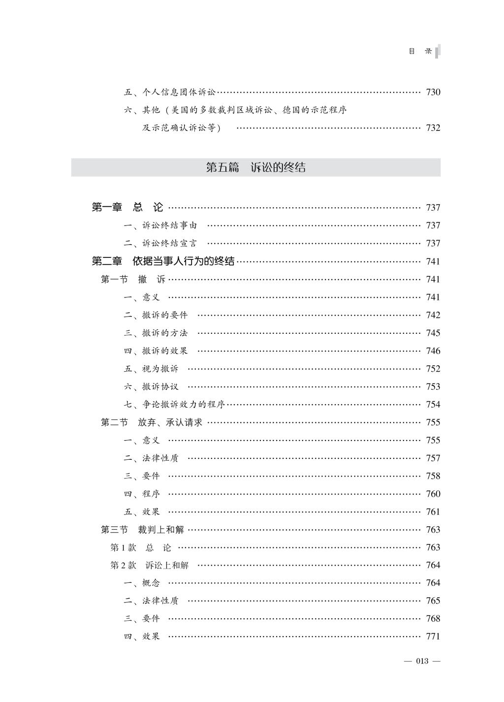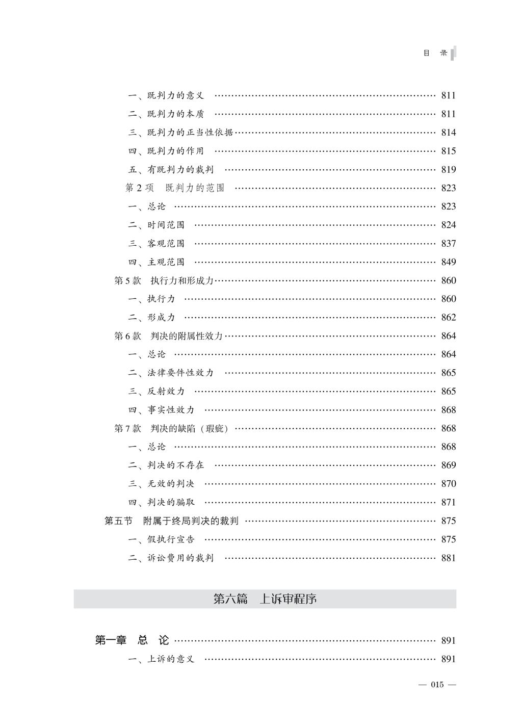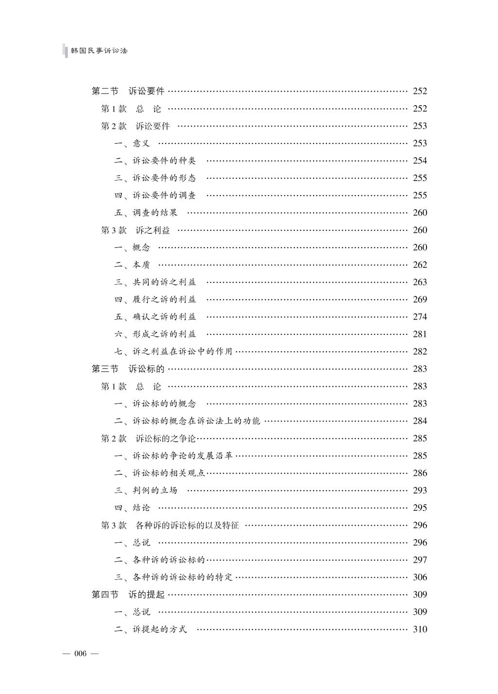 本书共分为八篇。第一篇绪论分为三章,第一章总论(民事诉讼的概念)、第二章民事诉讼法、第三章民事诉讼法的诚实信用原则;第二篇诉讼的主体分为两章,第一章法院(法院的组成、裁判权、管辖等)、第二章当事人即原告与被告(当事人的确定、当事人能力、诉讼能力、辩论能力、当事人适格、诉讼上的代理人等);第三篇第一审诉讼程序分为两章,第一章诉讼的开始(诉的意义及种类、诉讼要件、诉之利益、诉讼标的、诉提起的效果、赔偿命令制度、诉讼救助等)、第二章诉讼的审理(审理的基本原则、辩论、辩论的准备、辩论的内容、辩论的实施、期日的懈怠、证据调查、自由心证主义、证明责任、审理程序的进行和停止等);第四篇复合诉讼分为三章,第一章复数请求诉讼(请求的合并、请求的变更、反诉、中间确认之诉等)、第二章多数当事人诉讼(共同诉讼、第三人的诉讼参加、辅助参加、诉讼告知、当事人的变更等)、第三章解决集体纠纷的诉讼制度(选定当事人、集体诉讼等);第五篇诉讼的终结分为三章,第一章总论(诉讼终结宣言等)、第二章依据当事人行为的终结(撤回诉讼、放弃与承认请求、裁判上和解等)、第三章依据终局判决的终结(一般裁判、判决的种类与成立、判决的效力、假执行宣告、诉讼费用的裁判等);第六篇上诉审程序分为四章,第一章总论(上诉的意义、目的等)、第二章抗诉(抗诉的提起、审理、抗诉审的终局性裁判等)、第三章上告(上告的意义、上告理由、上告审程序等)、第四章抗告(抗告的意义、抗告程序、再抗告、特别抗告等);第七篇再审程序分为再审的意义、诉讼标的、合法要件、再审事由、再审诉讼程序、准再审等内容;第八篇简易、特别诉讼程序分为四章,第一章总论、第二章小额案件审判程序、第三章督促程序、第四章公示催告程序。